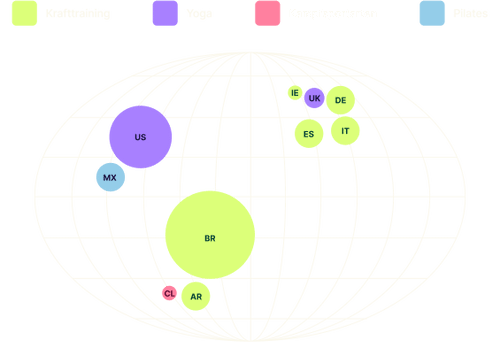 Krafttraining entwickelte sich zur beliebtesten Fitnessaktivität weltweit, obgleich im Vereinigten Königreich und in den Vereinigten Staaten Yoga sehr verbreitet war. In Mexiko war Pilates die erste Wahl.
