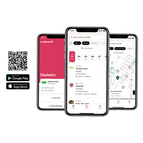 Find nearby gyms and studios, book your weekly classes and personal training sessions, and explore top wellness apps — all with the Wellhub app. To explore Wellhub, scan the QR code or download it via Google Play or App Store on your device.