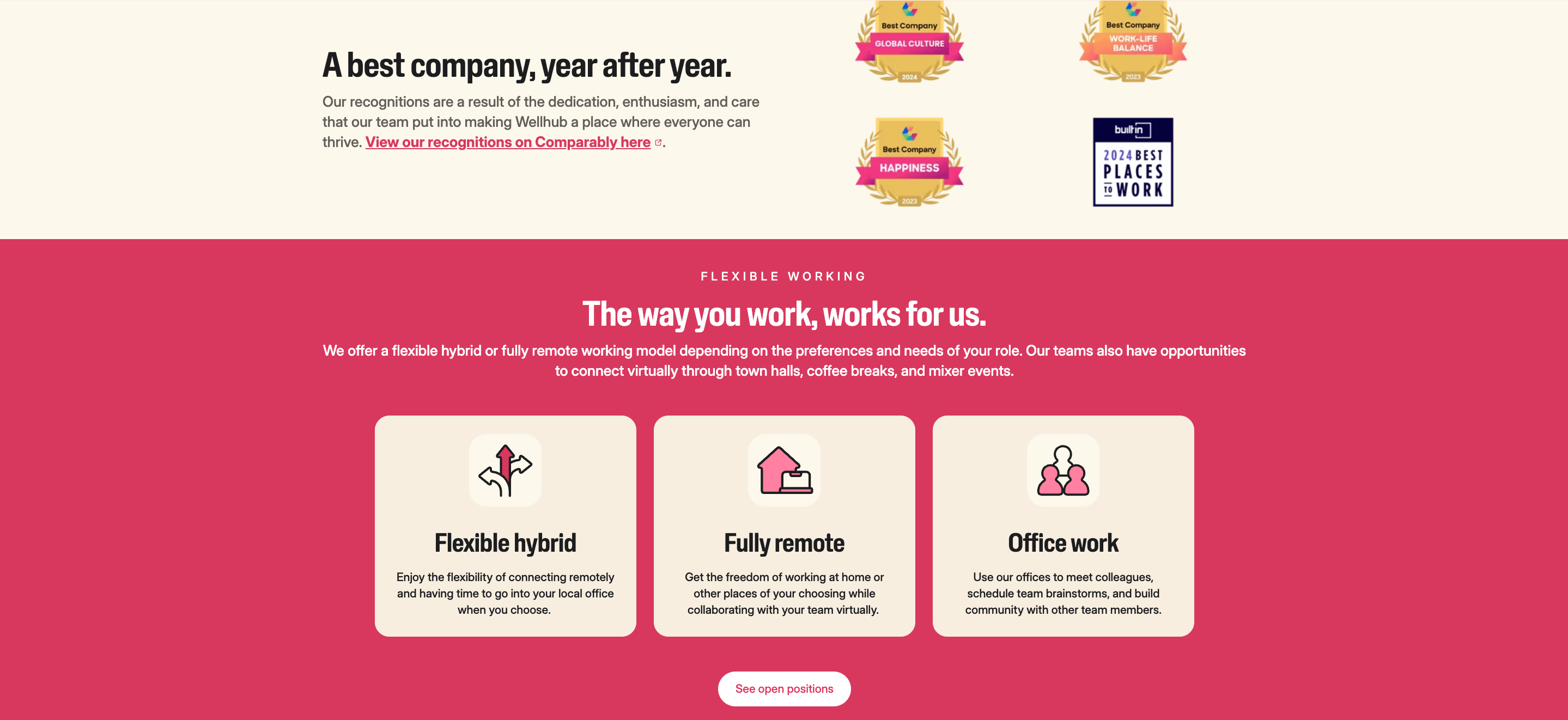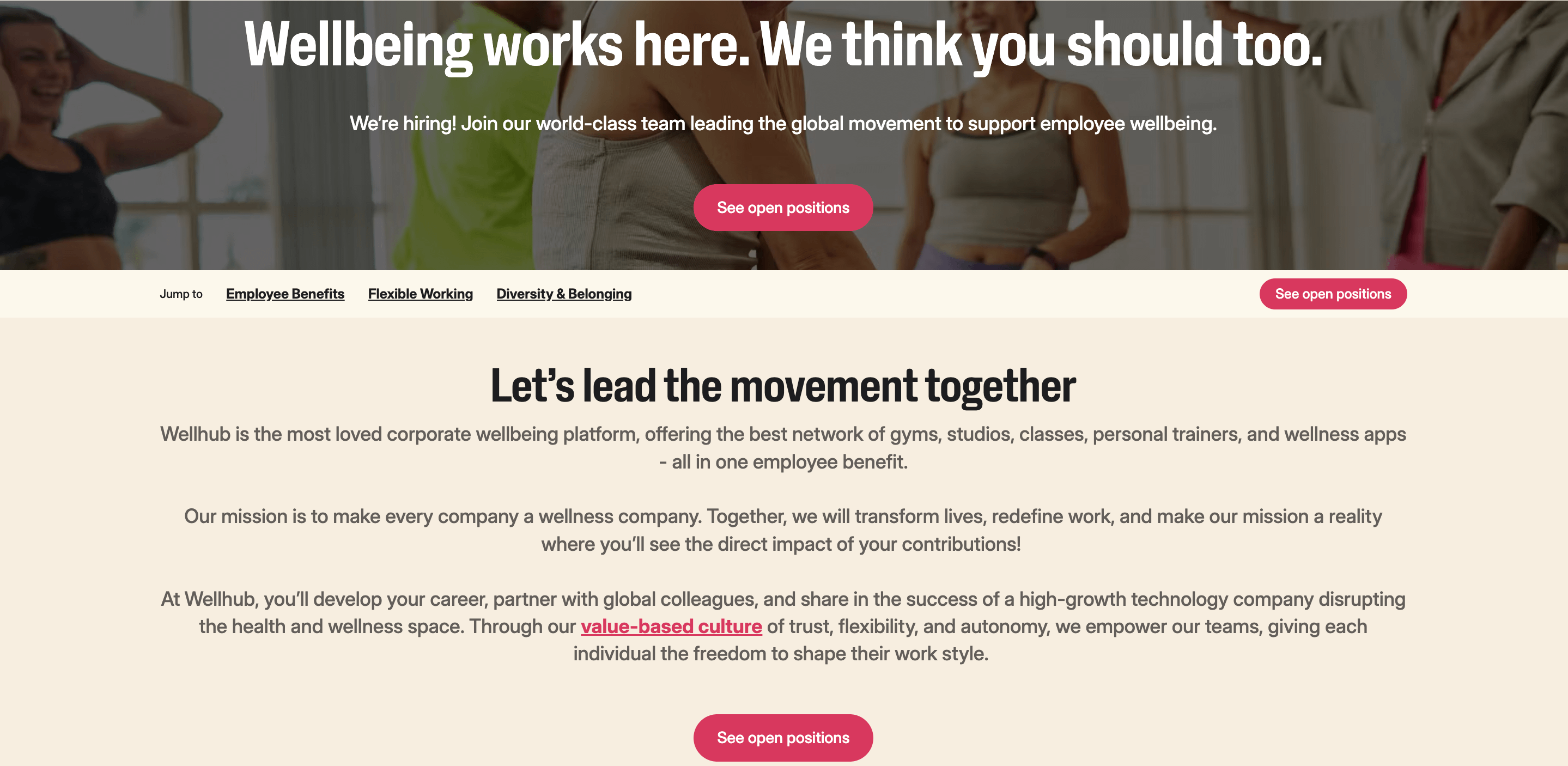Right at the top, Wellhub’s page opens with a bold statement: “Wellbeing works here. We think you should too.”