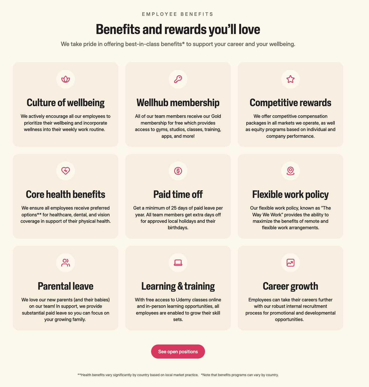 As you scroll down, you hit a section that proves Wellhub’s employee value proposition: a grid of clearly defined, best-in-class benefits.