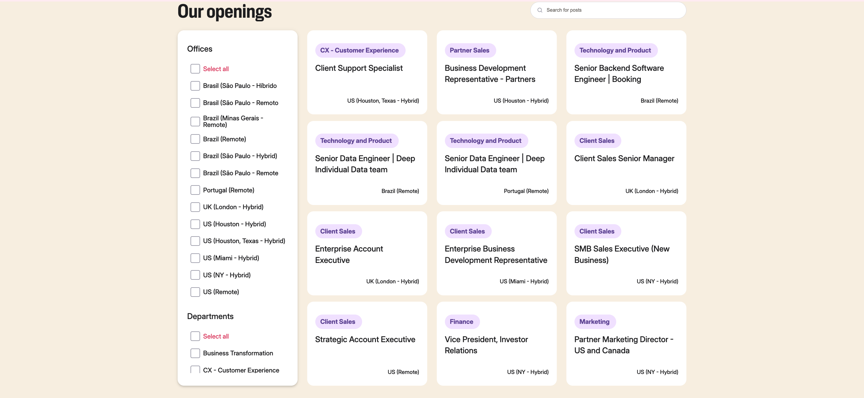 Filters by location and department help candidates drill down quickly. Each job title is tagged with clear location info (e.g. “Remote,” “Hybrid”) so there’s no guessing.