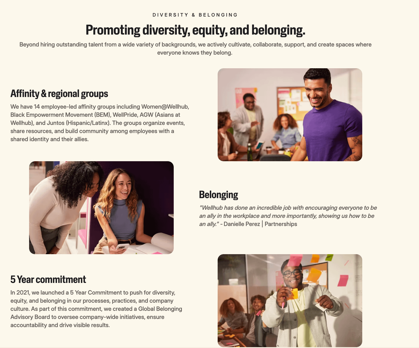 Further down, we see what DEIB looks like in practice. Affinity groups, a 5-year DEIB commitment, and a quote from an employee about allyship bring it all to life.