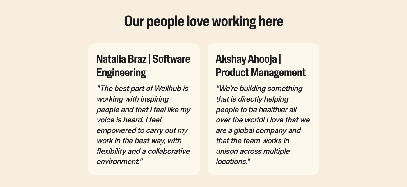 Instead of bland testimonials, Wellhub features quotes from real team members in different departments. These testimonials touch on career growth, flexibility, collaboration, and empowerment—all in their own words.