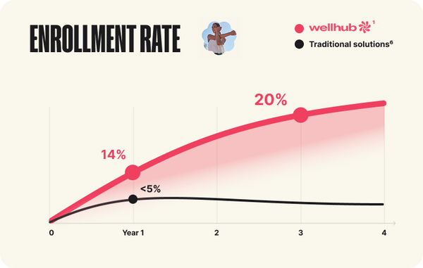 Wellhub drives strong, sustained engagement when compared to traditional wellness programs, including employee assistance programs (EAPs), corporate gym memberships, weight management services, and mental health/therapy.⁶ While many platforms plateau below 5%, Wellhub drives incremental employee adoption—month after month, year after year.¹