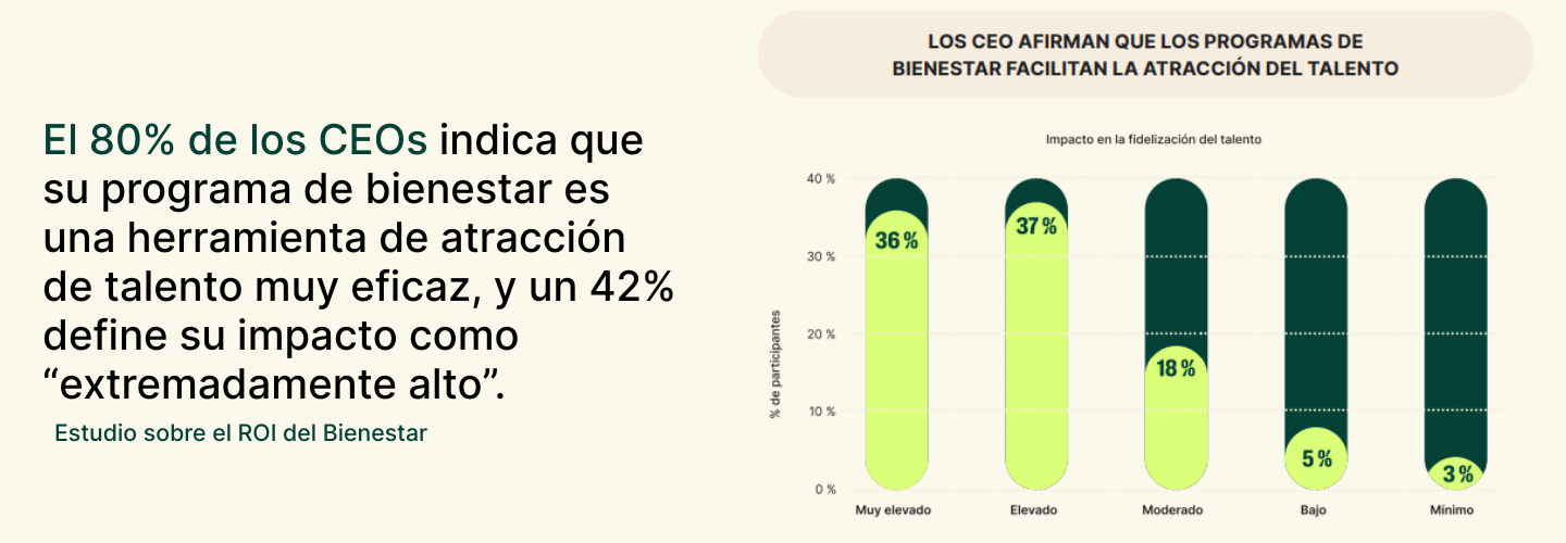 Invertir en el bienestar de los empleados también fortalece la lealtad. Quienes trabajan en empresas con programas de bienestar tienden a permanecer más tiempo. Además, muchas personas consideran estos programas como un motivo decisivo para aceptar un empleo por encima de otro. De hecho, hemos entrevistado a cientos de líderes de empresas y Recursos Humanos con nuestros reportes sobre el Panorama del Bienestar o el ROI del Bienestar y lo que hemos encontrado es lo siguiente: