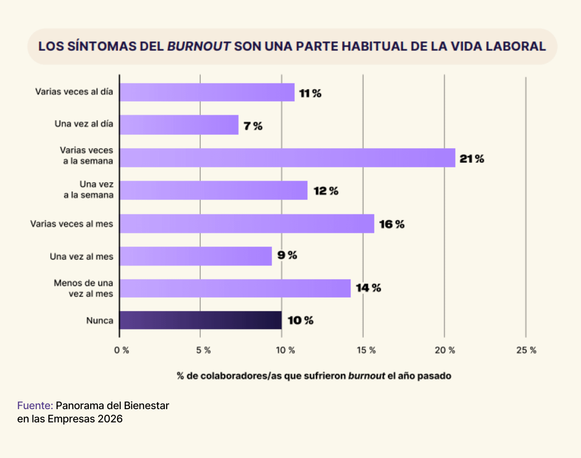 ¿Por qué las empresas deben prestar atención a este problema? El impacto del burnout trasciende el bienestar individual y se traduce en pérdidas tangibles de productividad, compromiso y permanencia del talento. Se ha encontrado que las personas que sufren de burnout frecuente presentan mayores dificultades para cumplir objetivos, mayores síntomas de depresión y una intención significativamente más alta de renuncia. En paralelo, nuestro reporte sobre el Panorama del Bienestar en las Empresas encontró que casi 4 de cada 10 trabajadores experimentan síntomas de agotamiento de manera semanal.