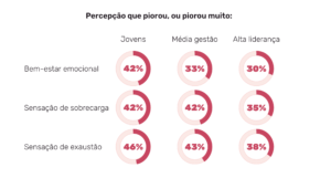 Desde 2020, grande parte da força de trabalho global foi obrigada a trabalhar de casa. Para alguns colaboradores, esse era um cenário novo e que trazia desafios para o dia-a-dia, como não conseguir impor limites na carga horária de trabalho e precisar conciliar, em um mesmo espaço, atividades laborais e de autocuidado. Não surpreende ver que funcionários de todos os cargos tiveram a percepção de piora no seu bem-estar emocional, na sensação de sobrecarga e de exaustão.