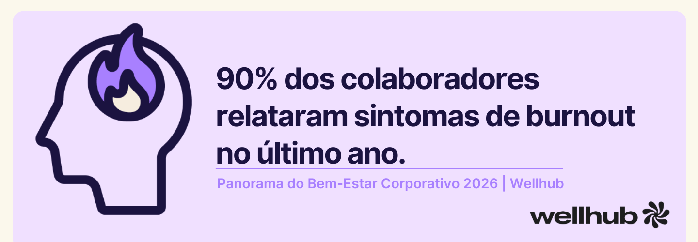 Dados do Panorama do Bem-Estar Corporativo 2026 do Wellhub mostram a dimensão do desafio: 90% dos colaboradores relataram sintomas de burnout no último ano. Ao mesmo tempo, fatores como a privação de sono (44%) e o estresse no trabalho (40%) aparecem entre os principais elementos que comprometem o bem-estar e a resiliência emocional dos profissionais.