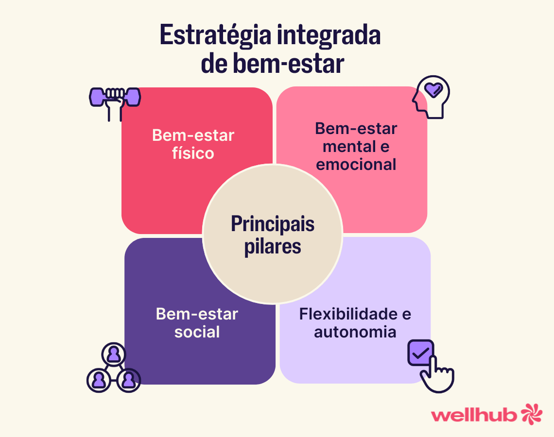 - Integração com cultura e liderança: o bem-estar não vive à margem da empresa, ele está dentro da forma de trabalhar. RH, líderes e gestores o refletem em suas práticas diárias.