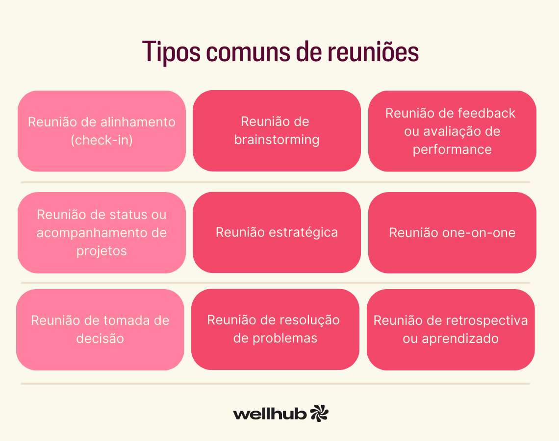 A seguir, você encontra 9 tipos comuns de reuniões que aparecem na rotina da maioria das empresas: