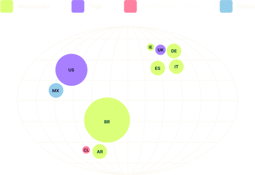 Descobrimos que a musculação é a modalidade mais popular no mundo todo. A yoga tem muitos adeptos no Reino Unido e nos Estados Unidos, enquanto o Pilates é a primeira opção no México.