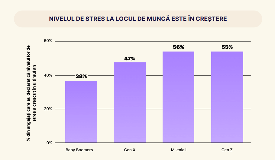 Angajații se confruntă cu niveluri de stres și epuizare fără precedent — mai ales generațiile tinere. Peste jumătate dintre membrii Generației Z (55%) și ai Millennials (55%) declară că nivelul lor de stres a crescut de la un an la altul, în comparație cu 47% dintre cei din Generația X și 38% dintre Baby Boomers.