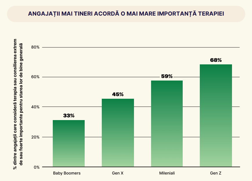În paralel, terapia a devenit o formă tot mai importantă de susținere. Generațiile tinere apelează la ea într-un număr tot mai mare: 68% dintre reprezentanții Generației Z și 59% dintre Millennials consideră terapia esențială pentru wellbeing-ul lor, în comparație cu 45% dintre cei din Generația X și 33% dintre Baby Boomers.