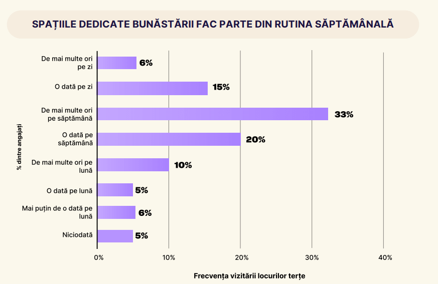 Aceste locuri nu mai sunt considerate un lux, ci o necesitate, pe care oamenii o integrează tot mai firesc în ritmul vieții lor. Trei sferturi (74%) dintre angajați le frecventează cel puțin o dată pe săptămână, iar 21% merg zilnic. Ele oferă un sentiment de apartenență și responsabilitate, iar 62% dintre respondenți spun că sprijinul comunității este esențial pentru menținerea unor obiceiuri sănătoase.